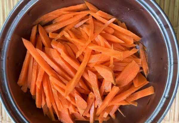 2.胡蘿卜洗凈去皮,去皮後的胡蘿卜放在案板上切細片,再改刀切成細絲狀。切好後的胡蘿卜放在盆中備用;