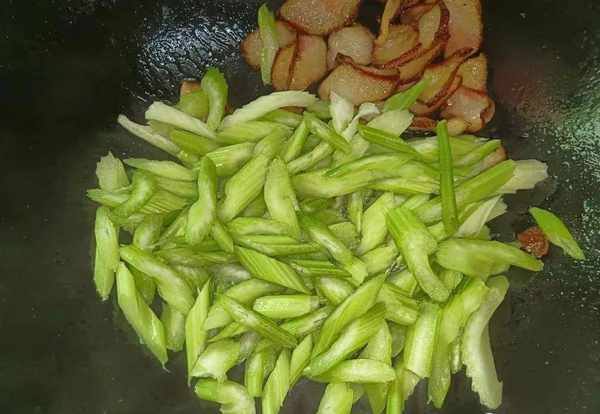 3.炒好後,我們將芹菜的莖放入裡面。下鍋後用鏟子翻炒均勻,然後把葉子也放入裡面。食材炒均勻後,加入適量的食鹽跟蠔油調味,再將它們翻炒均勻;