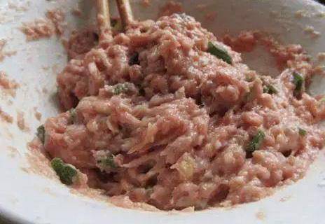 然後準備肉餡,加入適量蔥末攪拌均勻,再依次加入鹽,味精,料酒,老抽調味即可。