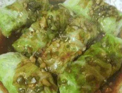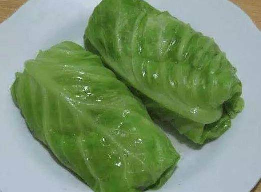 然後把包菜鋪平,取適量肉餡放在包菜上,再順著一邊把包菜卷起來,這個與眾不同的“餃子”就做好瞭。