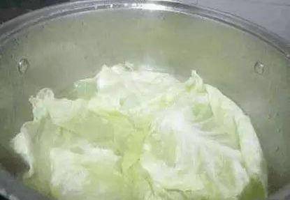 首先準備適量包菜,把包菜洗凈剝皮,坐鍋在溫水中燙一下。