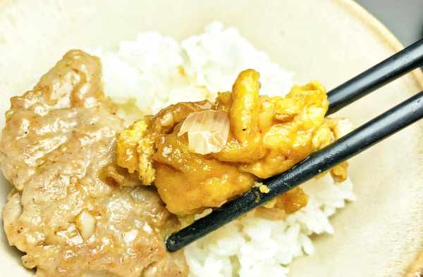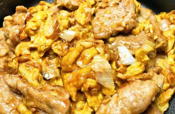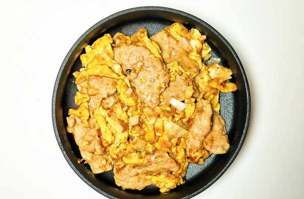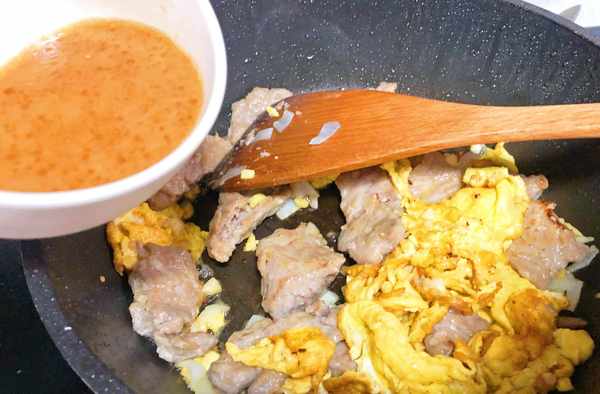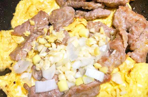 5、雞蛋炒散以後,下入炒過的裡脊肉、2片生薑、4瓣蒜末以及1小段大蔥,翻炒出香味。