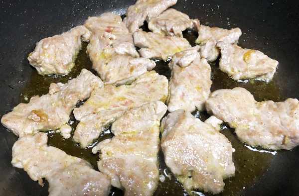 3、起鍋燒油,調中火,等油溫4成熱後,下入醃制好的裡脊肉,快速翻炒至變色後即可盛出。