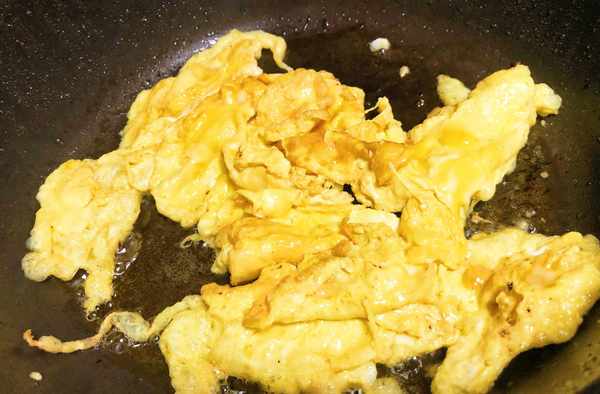 4、重新起鍋燒油,調大火,等油燒冒煙後下入雞蛋,把雞蛋炒散。
