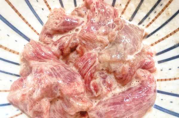 2、無論用羊裡脊還是牛裡脊,一定要橫刀切,這樣口感比較好,如果不好切可以先把肉放冰箱冷凍一下,凍到稍微有些發硬後就會好切很多。