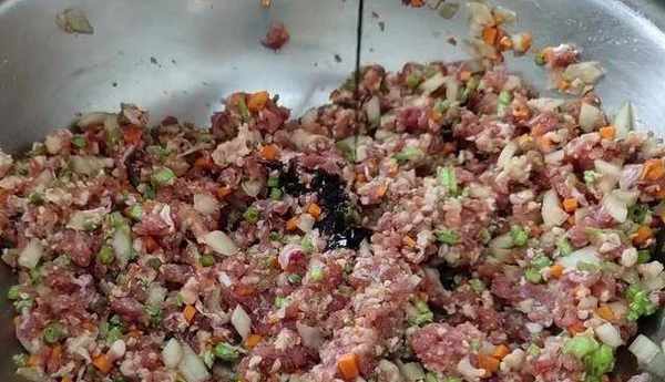 先切一小把的芹菜,把芹菜切成小丁。切好後放到肉餡中,胡蘿卜先切片,切成條。最後切成丁放入盆中,洋蔥先切條,再切成絲放入盆中,再依次加入十三香、海鮮、醬油、精鹽,然後往面裡加油,用手攪拌上勁。接著加點老抽調色,然後攪勻。