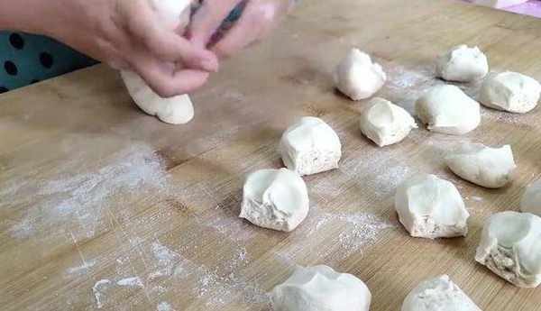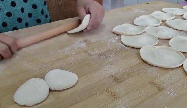 再淋入點熟油,用手繼續攪勻上勁,最後倒入適量的香油,攪拌均勻就可以瞭。一個小時後我們的面已經發好瞭,面板上撒上白面,再把發好的面揉勻排氣,排好氣搓成長條,再切成兩半。然後就做成劑子瞭。劑子全部做好後撒上一層白面,用手按成餅。全部搟成包子片。