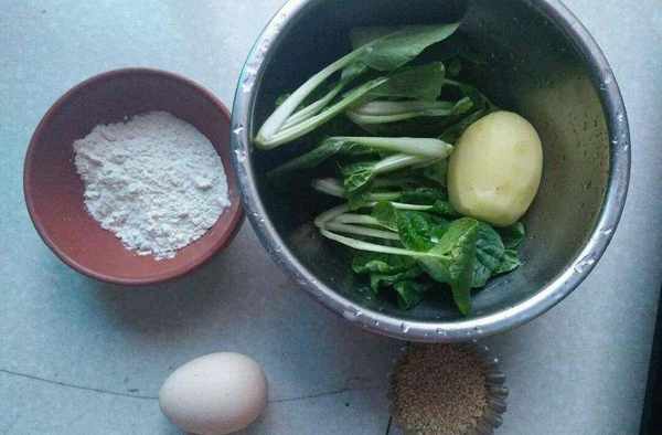 將青菜清洗幹凈,然後切碎,放入大的盤子中,將面粉倒入青菜盤中,並將雞蛋打入菜盤中,一起攪拌,並加入適當的鹽,攪拌均勻。