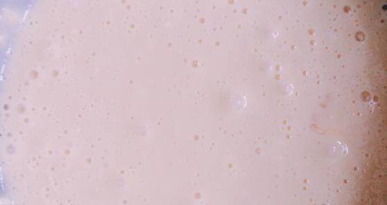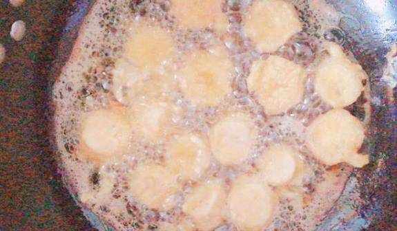 4.粘糊調好後起鍋燒油,油溫七成熱。把香蕉段放入粘糊中,全部裹起來面糊。