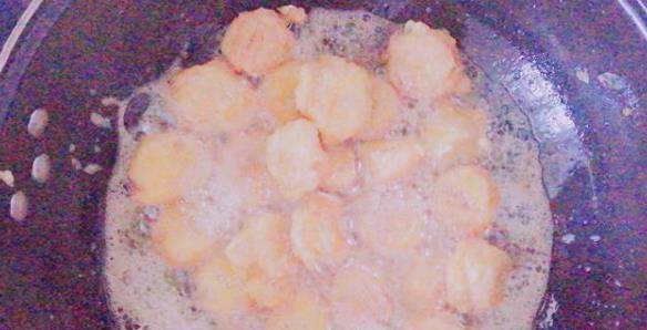 7.為瞭讓其更酥脆,我們再把油溫加熱到八成熱。把炸好的香蕉段再重新炸一遍,大約炸20秒就可以瞭!