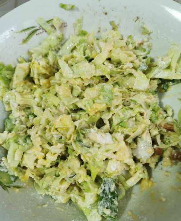 第一步,卷心菜洗凈,切碎。把雞蛋打入面粉中,加入卷心菜,蔥花,適量鹽,胡椒粉,攪拌均勻。菜裡面不用加水,攪拌成粘稠狀即可。
