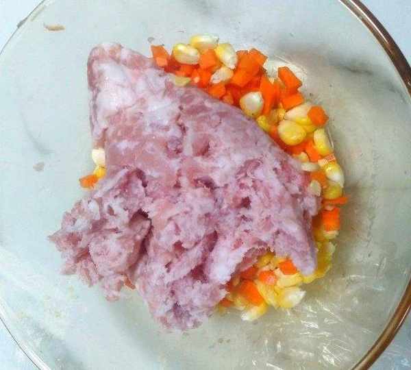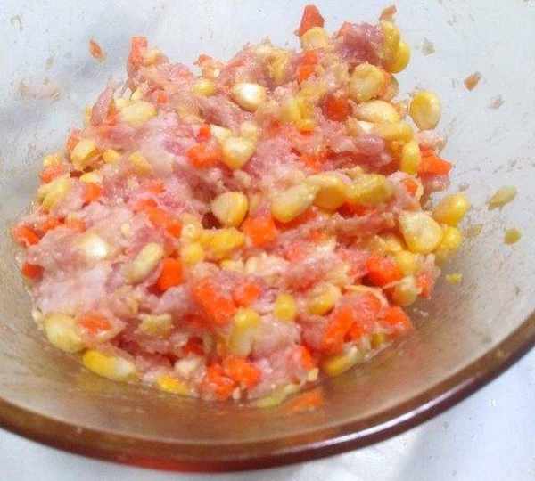 原料:紅蘿卜、黃瓜皮、面粉、豬肉、玉米、紅蘿卜、鹽、花生油、蠔油、胡椒粉、白糖、蔥花。