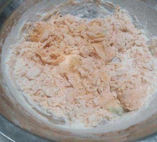 第4步、放入面粉,再加一克的鹽,然後用筷子攪成面絮狀。