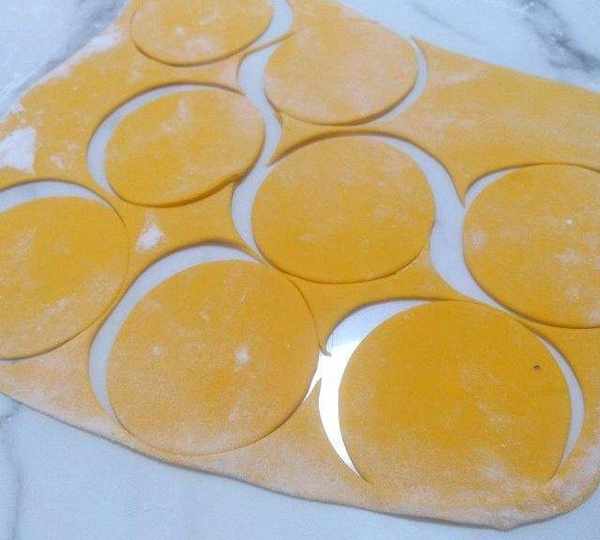 第6步、用趕面杖趕成0.1厘米厚度的薄片,用模具印出餃子皮。