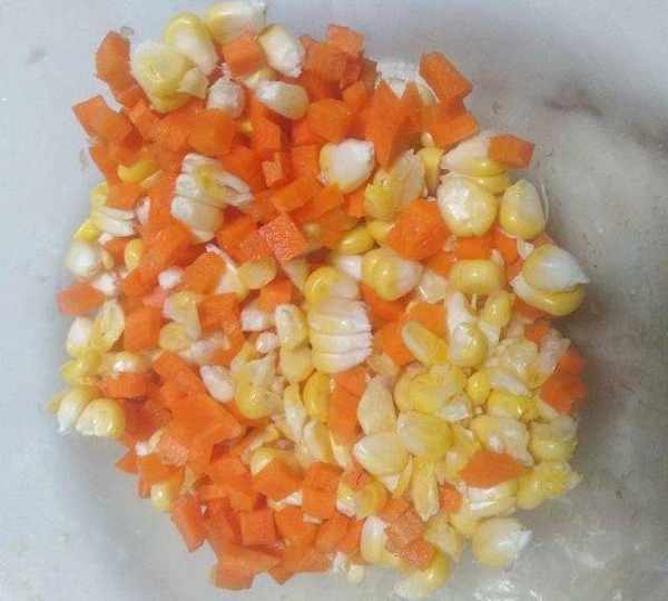 第7步、餡料:把蘿卜切成小丁。玉米掰下來。