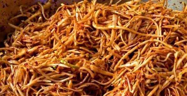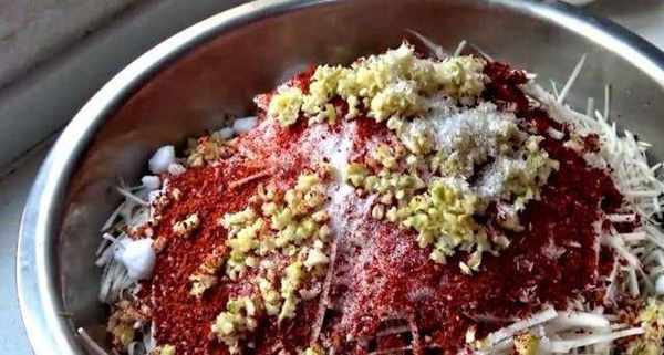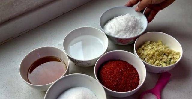 切完以後來給芥菜絲調下味,放入花生油200克、白醋300克、白糖300克、蒜末200克、辣椒面200克、食鹽500克,用手充分的翻拌均勻。