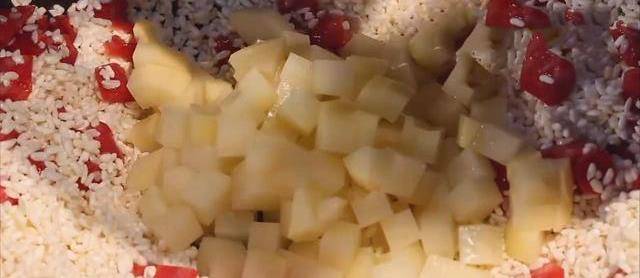7.水幾乎幹dry後,轉小火並加水(水和米可以平行),合上蓋子燉7-8分鐘.第二次加水是為瞭讓米飯得到充分的焗制,這樣做出的時蔬焗飯才更飽滿、更勁道、口感更好.在這不要翻轉刻錄過程,這也是焗制米飯的關鍵所在之一,可以保證米飯能夠充分入味,避免味道流失.