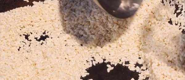2.將少許基礎油倒入鍋中,打開中火,將生米倒入鍋中炸至油變熱為止,直到米色呈白色且口感酥脆,整個過程大約需要1分鐘.通過油炸,大米可以快速成熟並快速品嘗,從而使大米從內向外散發出天然的香氣.