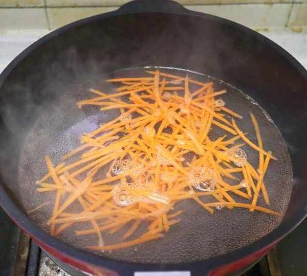 第2步、胡蘿卜擦絲,鍋中放清水,水開後放胡蘿卜絲焯水30秒撈出來。