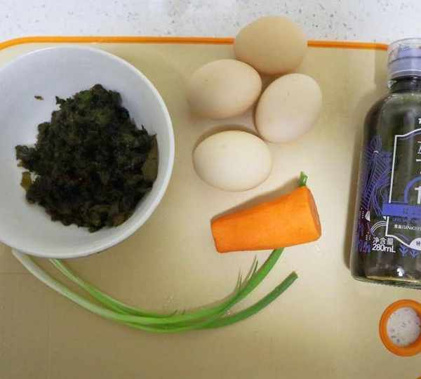 第1步、準備主要食材:地皮菜提前用溫水泡發,小蔥,胡蘿卜,雞蛋。