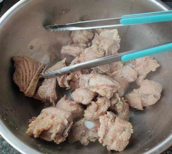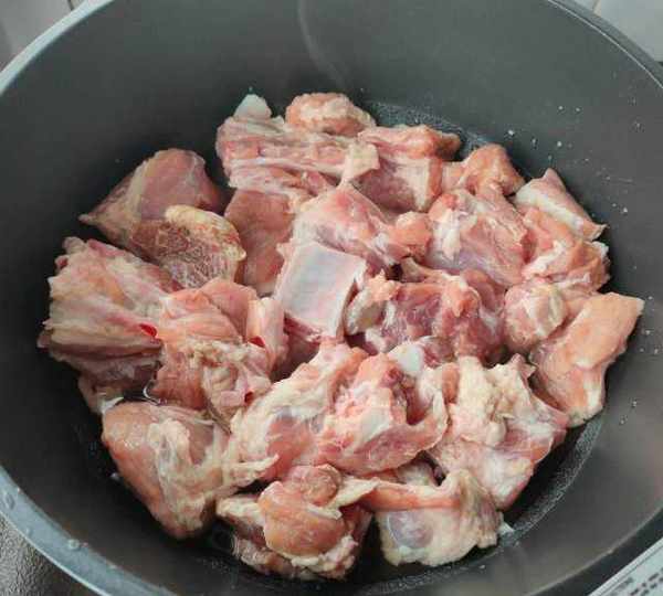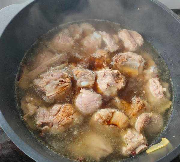 第6步、倒入純凈水,剛剛沒過排骨即可,再加入3勺生抽醬油。
