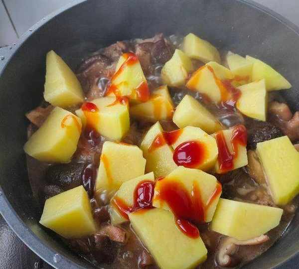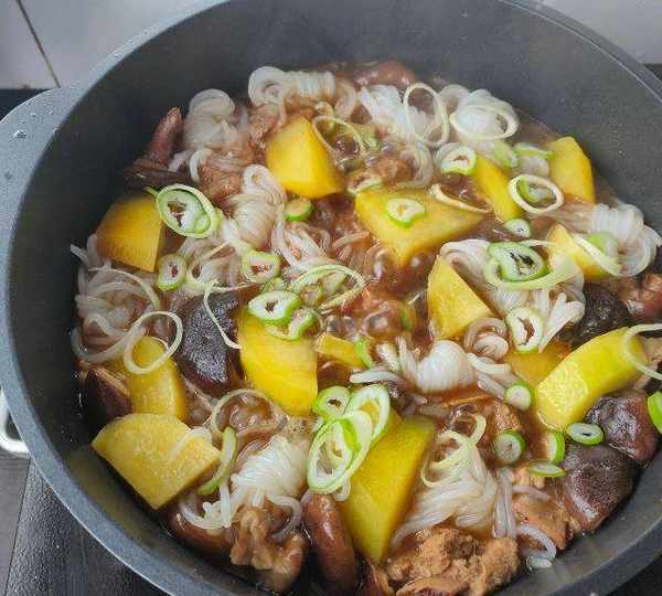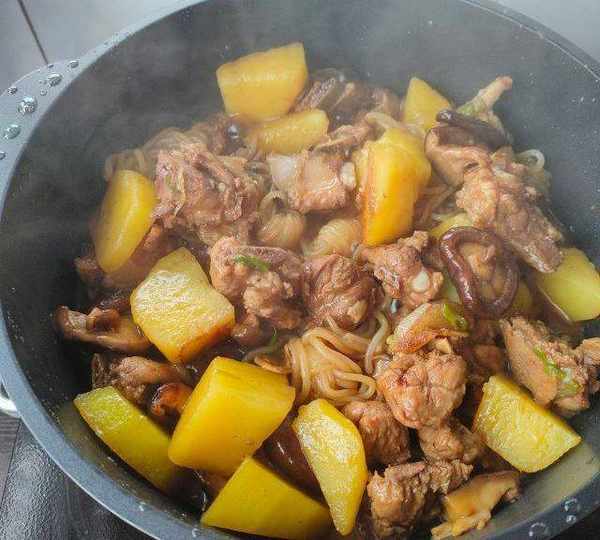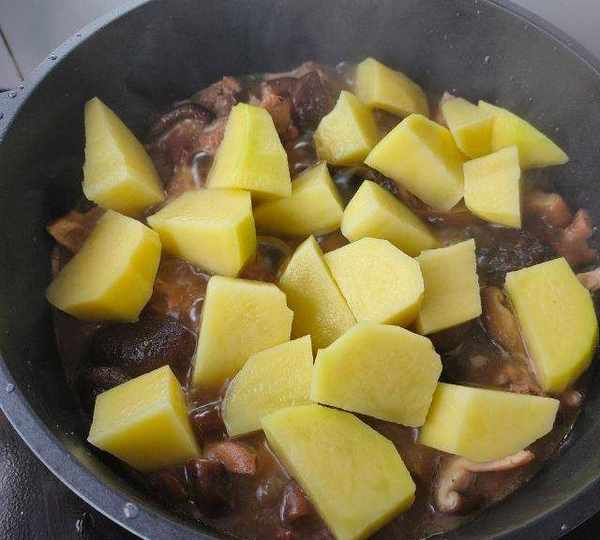 原料:土豆、香菇、排骨、魔芋絲、薑片、蔥花、花椒、植物油、鹽、料酒、生抽、老抽。
