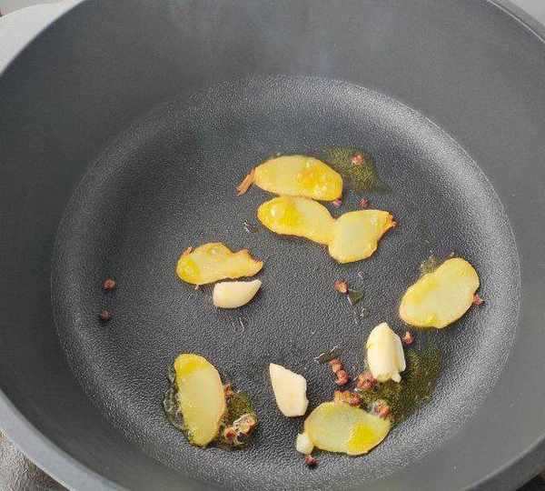 第4步、起鍋熱油,下薑片、花椒爆香。