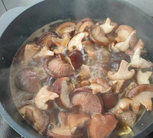 第7步、燙洗幹凈的香菇撕成小塊後倒入鍋內。