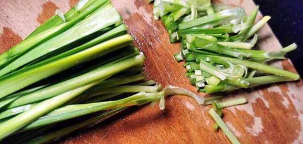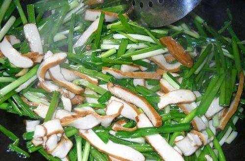 1、韭菜擇洗幹凈之後切段,韭菜梗和韭菜葉必須分開來放,然後準備香幹切成薄片,把鍋燒熱放點油,開小火把香幹煎一煎,煎至金黃起泡後盛出來,這樣香幹味道更香也更入味,