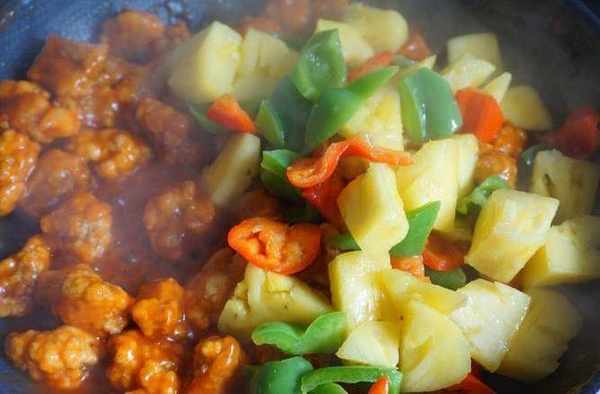 3、然後再切點菠蘿片,鍋留底油,放點蒜末炒香後,放番茄醬白糖,白醋清水各一勺,熬制粘稠後,把炸好的肉丁,切好的菠蘿下鍋,翻炒均勻,撒點白芝麻,就可以出鍋啦,美味又實惠,端上桌傢人搶著吃。