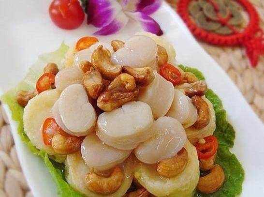 帶子12個、日本豆腐4條、生菜1顆、腰果50克、紅椒1個、雞蛋1個、生粉適量、薑1片、料酒1茶匙、鹽、糖、胡椒粉各1/3茶匙