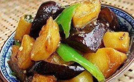 2.鍋內留底油,放入青椒、薑末和蒜茸拌炒,再往鍋中倒入茄子、土豆,點適量鹽、醬油和白糖;水淀粉勾薄芡,使醬汁均勻掛在食材上,點雞粉翻炒勻即可。