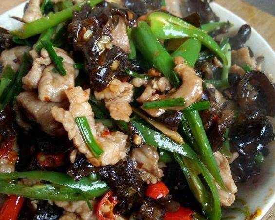 木耳炒肉:裡脊肉,木耳,蔥,生抽,醋,水淀粉,料酒,鹽,雞精