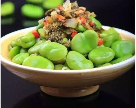 材料:蠶豆250克,雪菜150克,油鹽薑蔥適量。
