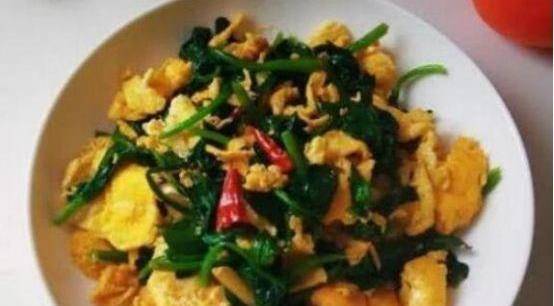 3、鍋中加適量的植物油將雞蛋炒熟,加入焯好的菠菜再加入鹽和味精翻炒均勻即可。