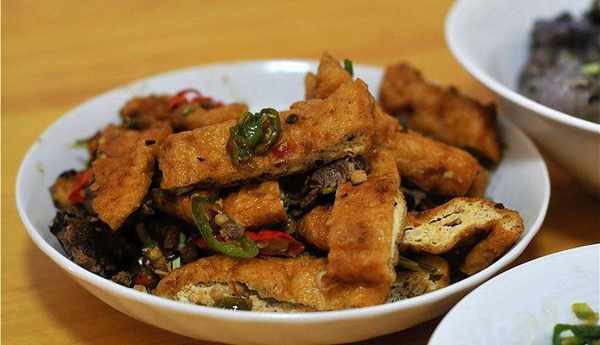 自傢油炸的油豆腐,拌著中午剩下的一點豬頭肉,好吃到骨頭裡啦