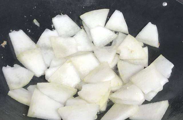 4、大火爆香蔥白後下入冬瓜翻炒,加入適量鹽、胡椒粉調味