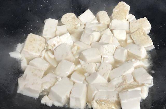 3、鍋裡冷水下入豆腐焯水,加入一點鹽去去腥味,豆腐焯水後控幹水,再熱鍋下油將豆腐煎至兩面金黃盛出