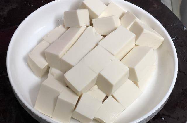 2、豆腐用水沖洗一下後切成小塊,我買的是水豆腐,所以很容易爛,沖洗的時候開小水就可以瞭