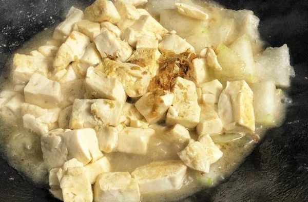 5、冬瓜快要軟爛的時候放入煎好的豆腐一起翻炒,30秒後淋入適量淀粉水和醬油,最後加入蔥花就可以出鍋瞭