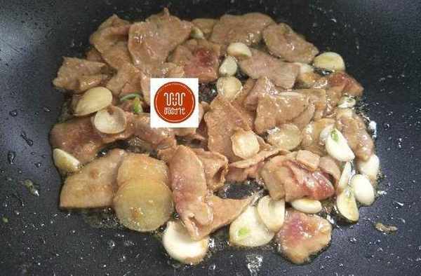 5、熱鍋冷油,先炒豬肉,然後下蒜片和薑片翻炒。