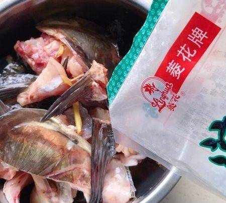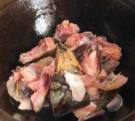 醃制好的魚頭瀝幹水分倒入鍋裡,這個時候不能去翻拌,煎2到3分鐘再翻面煎