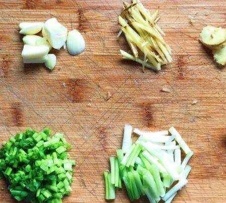生薑分別切成絲和片,小蔥的蔥白切成段,綠色部分切成蔥花,大蒜稍微切成小塊