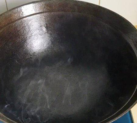 大火燒鍋,直到鍋冒煙(普通鐵鍋一定要燒燙,才不容易粘鍋)