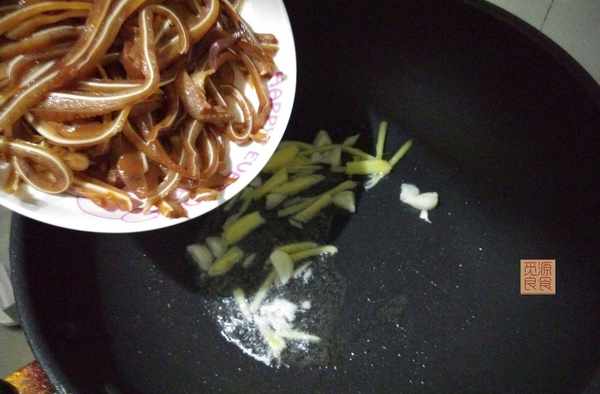 薑絲和蒜粒煸香後,放入剛剛豬耳下鍋炒香,下鍋翻炒均勻