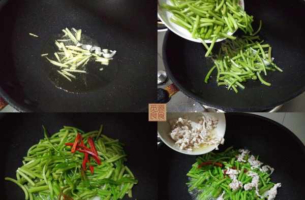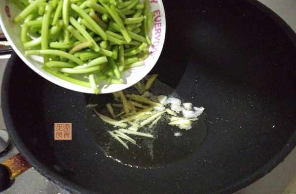 下面開始炒制莧菜菜梗炒青椒榨菜肉絲,鍋內放油,放入薑絲和蒜粒煸香