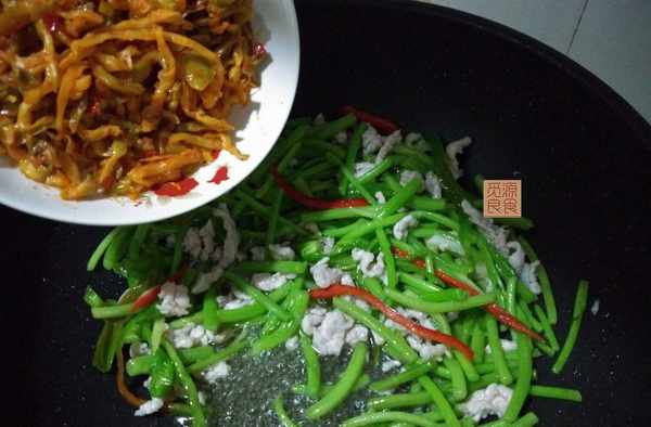 翻炒均勻後放入剛剛炒制好的肉絲翻炒