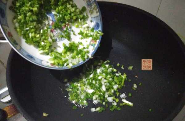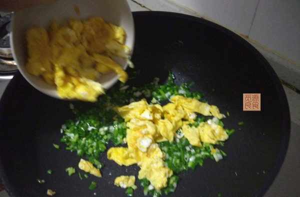 鍋內給油,放入香蔥蔥花炒香,然後放入雞蛋翻炒,放入鹽和胡椒,翻炒均勻後即可起鍋