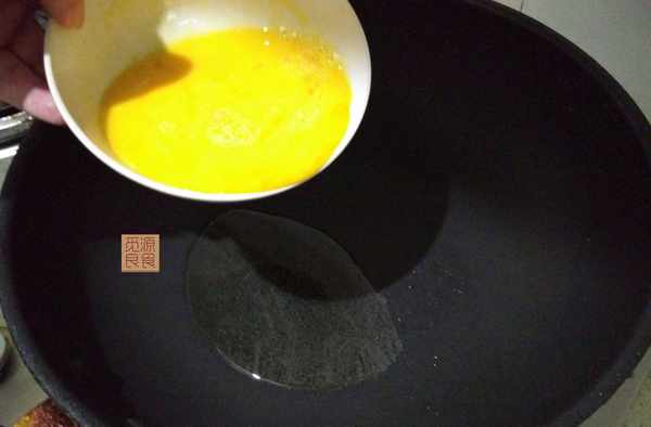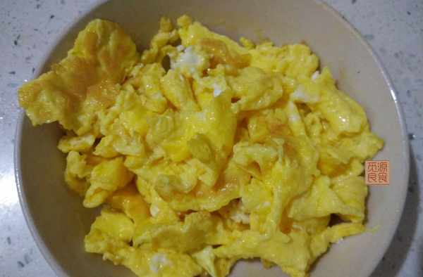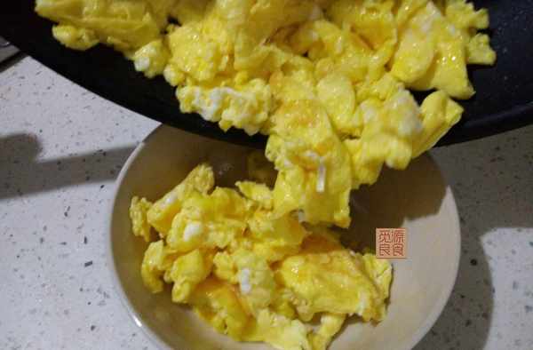 先下鍋炒制雞蛋,雞蛋下鍋後要不斷攪拌,讓雞蛋炒碎一些