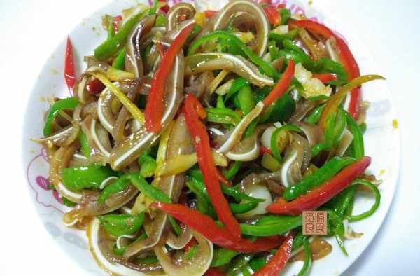 放入剛剛準備好的青椒絲和青紅椒絲翻炒,鹵菜已經很入味瞭,這道炒炒香後幾個出鍋,不用給鹽和其他調料